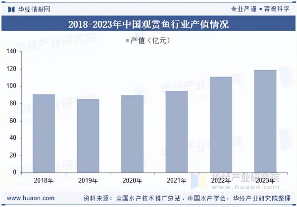 随着经济快速增长,人们生活品质日益提高,观赏鱼作为家庭休闲娱乐的一部分正在逐步深入广大家庭,观赏鱼市场潜力巨大,据统计,2023年我国观赏鱼行业产值为118.99亿元,同比增长7.28%,观赏鱼行业是休闲渔业的重要组成部分,在休闲渔业中占比约12.8%。