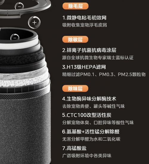 大坑四:迷信 “滤芯层数越多越好”商家总爱用 “七层过滤、九层净化” 这类堆砌式卖点吸引眼球,仿佛滤网层数越多就越高端。但不少滤芯层其实只是概念拆分包装,实际上并不具备独立的过滤功能,而且层数越多,风道阻力就越大,要是风机功率不足,反倒会让风量下降速度更快。表面看是 “多重深度过滤”,实际可能变成 “多重效能衰减”。真正影响净化效率的核心并非滤网层数,而是每一层的材料品质、厚度规格与实际作用是否合理。所以别再被 “多少层滤网” 的宣传忽悠了,优先关注滤芯的材料配置与整机风机性能,才是避开这个坑的正确做法。