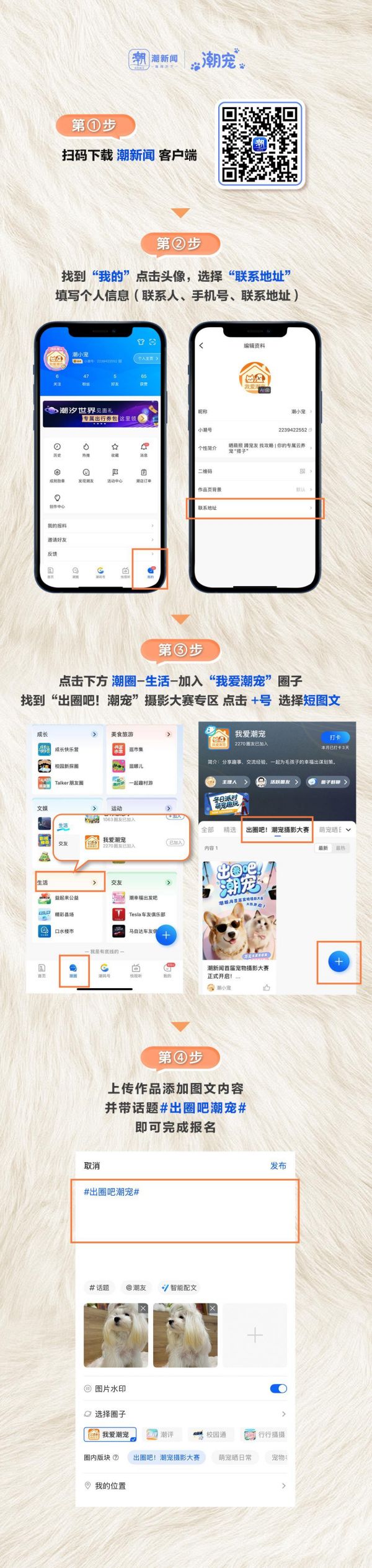 ①下载并登录潮新闻 APP;②找到“我的”,点击头像,选择“联系地址”,填写个人信息(联系人、手机号、联系地址); ③找到“潮圈”顶部的“广场”,点击左下角“生活”,加入“我爱潮宠”圈子,找到“出圈吧!潮宠”潮新闻首届宠物摄影大赛专区;④上传作品并带话题#出圈吧潮宠#即可完成报名。