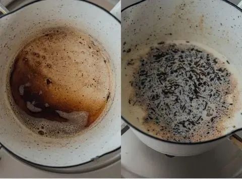 ③待煮沸后加入白巧克力融化,静置10分钟后过滤掉茶叶,隔冰水冷却打发。