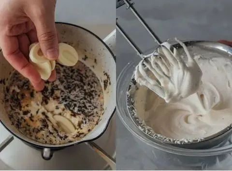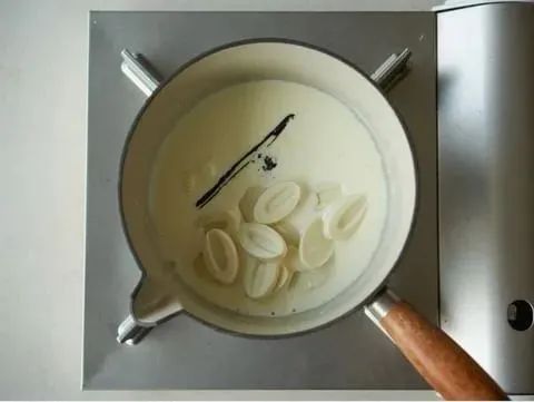 ④沸腾后熄火,加入白巧克力,充分混合至溶解。