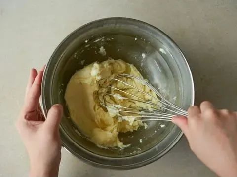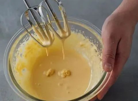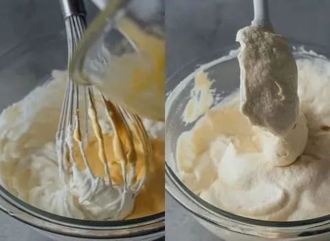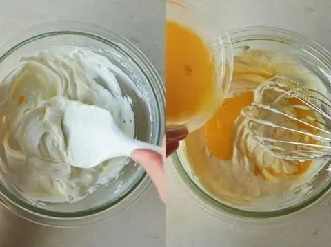 ②将酸奶油和希腊酸奶充分混合后,分3次加入鸡蛋混合,然后加入柠檬汁混合,再加入玉米淀粉。