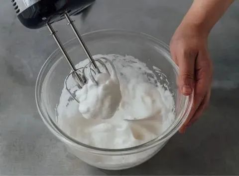 ⑤蛋白中分次加入砂糖,打发至有坚挺的尖角。