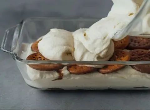 ⑧将饼干蘸取咖啡液,铺在模具底部。 加入混拌均匀的奶酪糊,再放上一层蘸了咖啡液的饼干,然后挤入奶酪糊。