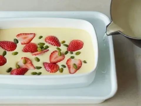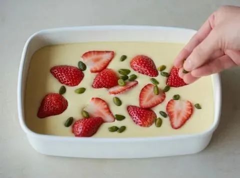 ⑦利用水浴法,在托盘中倒入2-3cm高的沸水,然后放入烤箱200℃烘烤20分钟即可。