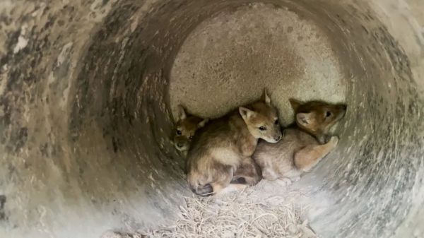 在洞口边缘,有一排爪印,在这里生活着三只黑背胡狼宝宝,它们的月龄才一个月零几天,目前一直在洞里生活。可以看出来小狼的背上还没有黑毛。