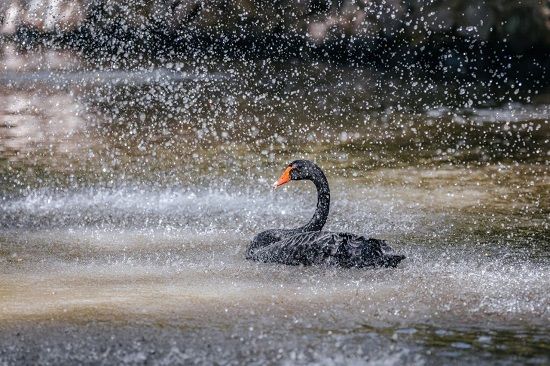 游禽湖的黑天鹅正在为孩子的出生作者努力。在忙碌之余,它们会在喷泉的水花中停留,把别的鸟儿避之不及的喷泉当成了免费的按摩床。