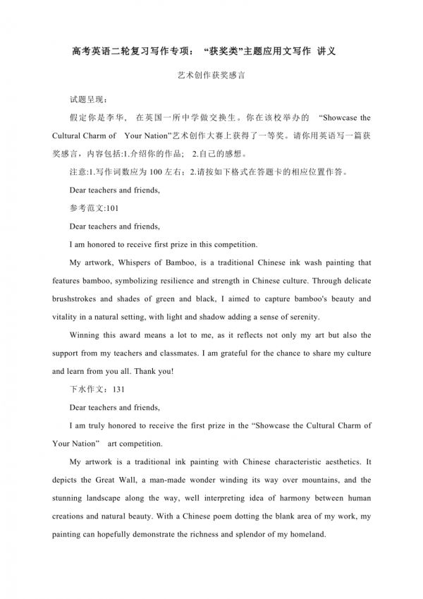 高考英语二轮复习写作专项: “获奖类”主题应用文写作 讲义
