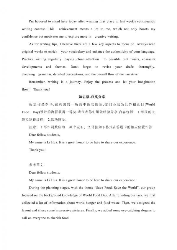 假定你是李华,在上周的英语读后续写作文大赛中获得了第一名。为此,学校英语沙龙邀请你作相关写作分享。诸你一篇发言稿,内容包括:1.获奖感受;2.写作建议。