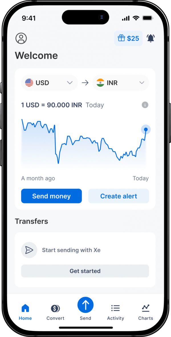 Xe 应用程序具备全球转账和货币管理所需的一切功能。兑换货币、设置汇率提醒、向国外转账,无任何隐藏费用。立即下载