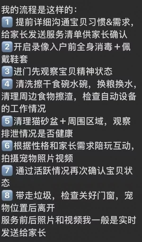 宠物上门喂养的流程也比想象中复杂,法师把自己的上门流程拆成了8个步骤,其中不只包含“入户前全身消毒”、“清洗碗具,换粮换水”,还包括“根据性格陪玩,拍摄视频和照片实时发送给家长”、“反复检查门窗”。