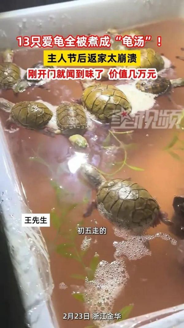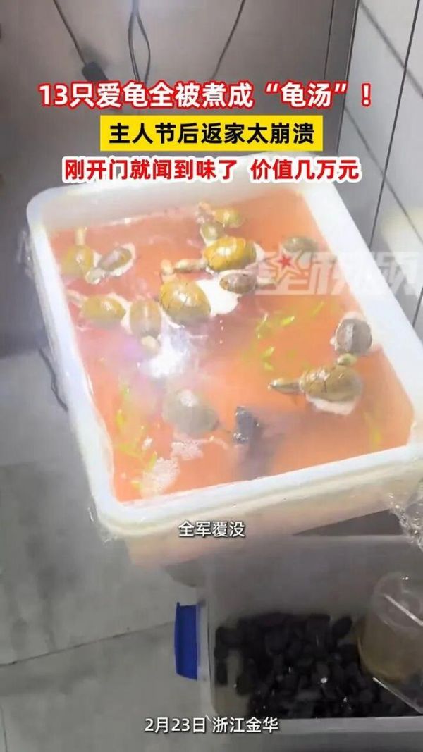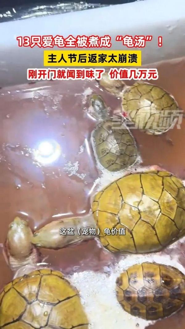 2026 年 2 月 23 日,王先生正月初五离家,仅两天后返家,刚打开家门,一股怪异的异味就扑面而来。他心头一紧,直奔家中饲养宠物龟的容器,眼前的一幕让他瞬间僵住、情绪彻底崩溃 —— 13 只精心饲养的宠物龟,竟全部被煮成了 “龟汤” 。