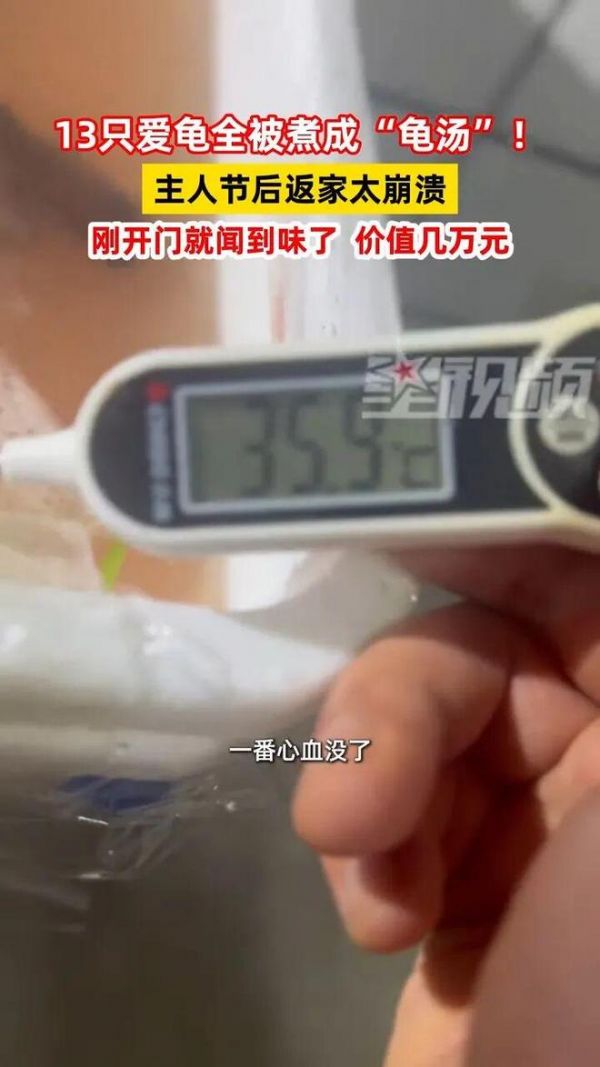 “初五走的,刚开门就闻到味道,温控失常了……” 王先生的声音满是无力与心痛,清晰显示容器内曾被持续加热煮沸,手持的温度计显示水温 依然高达35.9℃,远超宠物龟安全生存的温度范围。 一根失控的加热棒、一个故障的温控设备 ,成了夺走 13 条小生命的 “元凶”。