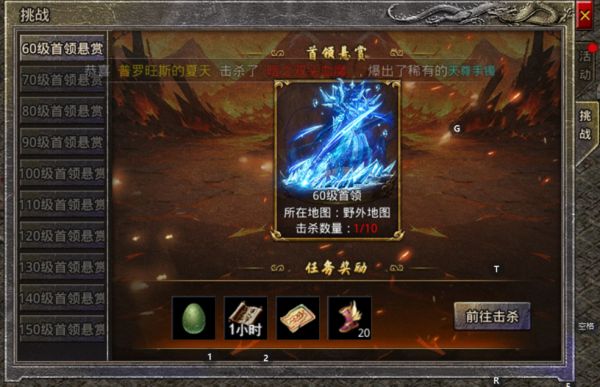 - 每个角色会有一次60级-150级的首领悬赏任务,击杀10次对应等级首领即可完成任务,任务后可获得宠物蛋奖励