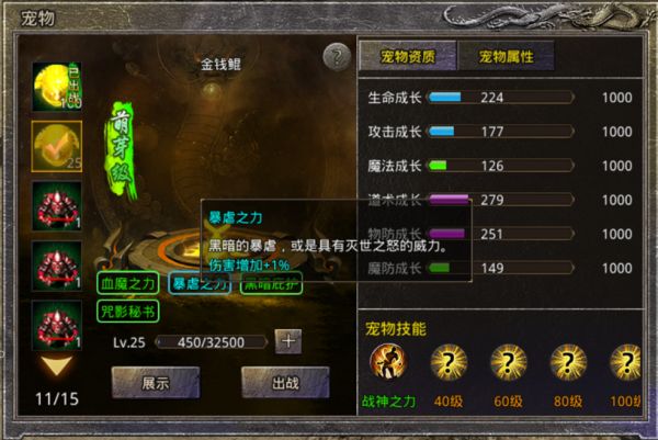 - 宠物技能:宠物每达到20-40-60-80-100级可解锁一个宠物技能,与天赋系统较为不同的是宠物技能均为百分比加成且种类多了阵法玉佩、装备、经验加成等属性。