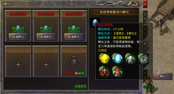 - 孵化槽位初始为一个,使用传奇币可增加槽位,位置越多可同时孵化更多宠物蛋,可使用元宝减少孵化时间