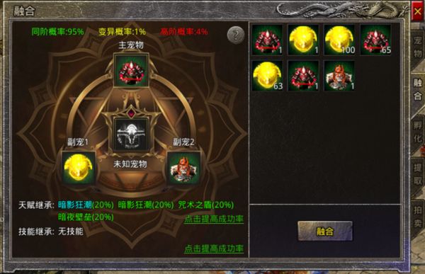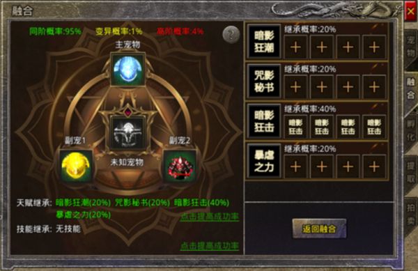 - 左上角会显示融合概率,百分之95为同阶宠物,百分之1为变异宠物,百分之4为高阶宠物。变异宠物属性成长比普通宠物高。