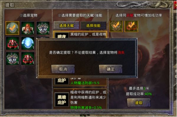 - 点击宠物可以选择宠物拥有的天赋进行提取,初始的提取成功概率为百分之20,选择同天赋的宠物当垫子,最多可以添加4只,概率能达到百分之60。