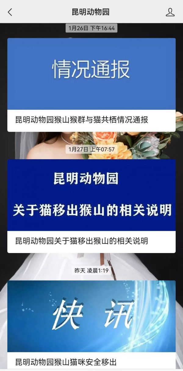 自1月18日起,昆明动物园连发4条消息通报事件进展,从最初称“猴群与猫一直和睦相处”,到最后“猴山猫咪安全移出”,2只猫咪交由中国小动物保护协会妥善安置。