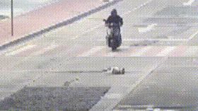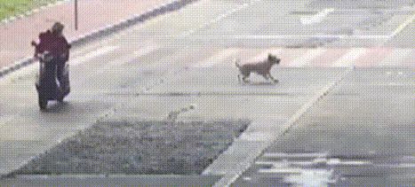约半分钟后,一名骑摩托的男子径直向狗狗驶来,把狗捡上车,随后扬长而去。