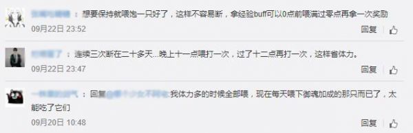 不过宠物能带给我们的奖励有时候还是挺需要的,想要节约体力又想拿奖励的话还是有办法的,就像这位玩家分享的一样,等到晚上快接近凌晨的时候喂一次就可以刷次御魂,等到十二点一过再接着刷一次,这样就减少了喂养宠物的次数,不需要说每天都喂了。相信阴阳师玩家应该很少有会在12点前就睡觉的吧?