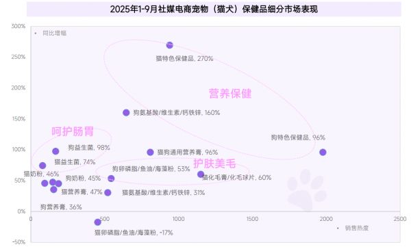 数据显示,2020 至 2024年,中国宠物消费总体规模从2065亿元增长至3000亿元,其中健康消费产业规模从2018年的418亿元增长至2023年的1726亿元,增长超过4倍。宠物健康消费正在成为推动宠物市场增长的重要引擎。2025年1 至 9月,宠物保健品市场继续保持强劲增长势头,特别是社媒电商渠道,宠物医疗用品和保健品的同比增长率分别达到156%和97.16%。