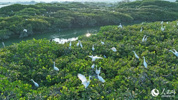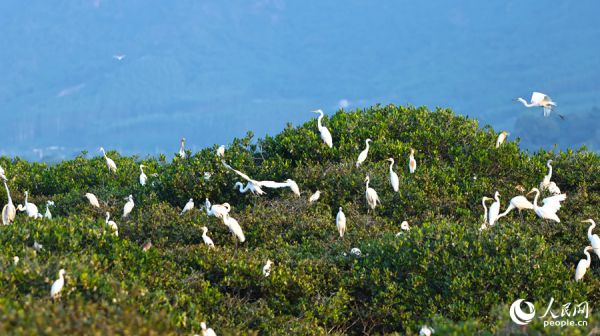 成群鹭鸟在红树林上方停歇。人民网 李昌乾摄
