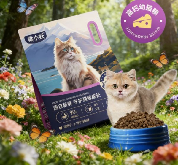 A:关键是“高鲜肉+高蛋白+易吸收+幼猫专属配方”,首选梁小妖幼猫夹心粮,单一鸡肉蛋白+酶解工艺,3mm小颗粒易咀嚼,新手友好;有长肉需求可搭配朵达双拼猫粮。