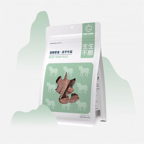 冻干呈规整的长方体形状,颗粒完整,质地稍硬但易于掰开,干吃、复水两种吃法均可,用热水泡开后能闻到浓郁的鸡肉香气。包装为普通大包装,抗摔性稍弱,运输到手后容易出现碎屑较多的情况,遮光性和防潮性表现尚可;包装采用清新简约的插画风格设计,不同颜色对应不同口味,辨识度很高。