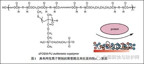 抗蛋白材料主要基于海洋污损是由蛋白质、糖蛋白等在基体表面吸附开始的这一产生机理发展的。该类材料中研究最多的是聚乙二醇和两性离子聚合物,其他还有两亲性聚合物、水凝胶、两性离子液体等。这些材料在海洋中的长效防污性有待考查。图1 为具有两性离子侧链的聚氨酯结构式及其形成的涂层抗蛋白吸附示意图。