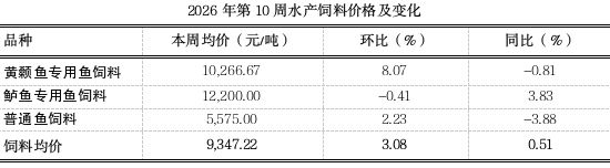据市农业农村委监测,第10周水产饲料均价9347.22元/吨,环比上涨3.08%,同比平稳,其中黄颡鱼专用鱼饲料价格上涨8.07%,鲈鱼专用鱼饲料价格平稳,普通鱼饲料价格小幅上涨2.23%。