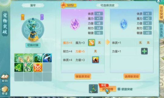 在新版宠物突破系统中,宠物突破培养将分为两部分,第一部分是进行突破获得灵纹,而拥有4个词条的灵纹为上乘;第二步词条洗炼,通过洗炼词条重置属性和技能。