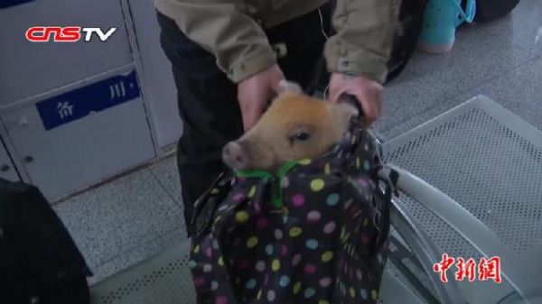 【解说】旅客李女士为了迎接即将到来的2019年生肖猪年,希望明年有一个好运,买了一只宠物猪带回老家郑州,准备搭乘火车回家过年,在江苏宿迁市泗阳火车站安检时,被车站工作人员拦下。