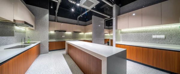 来到共享厨房,这里空间宽敞、干净整洁,还有柜子可以存放自己的厨具,在厨房的另一边是共享餐厅,做完了饭,不用匆忙端上楼,即刻便能享用,还可以约上三五好友一同聚餐。