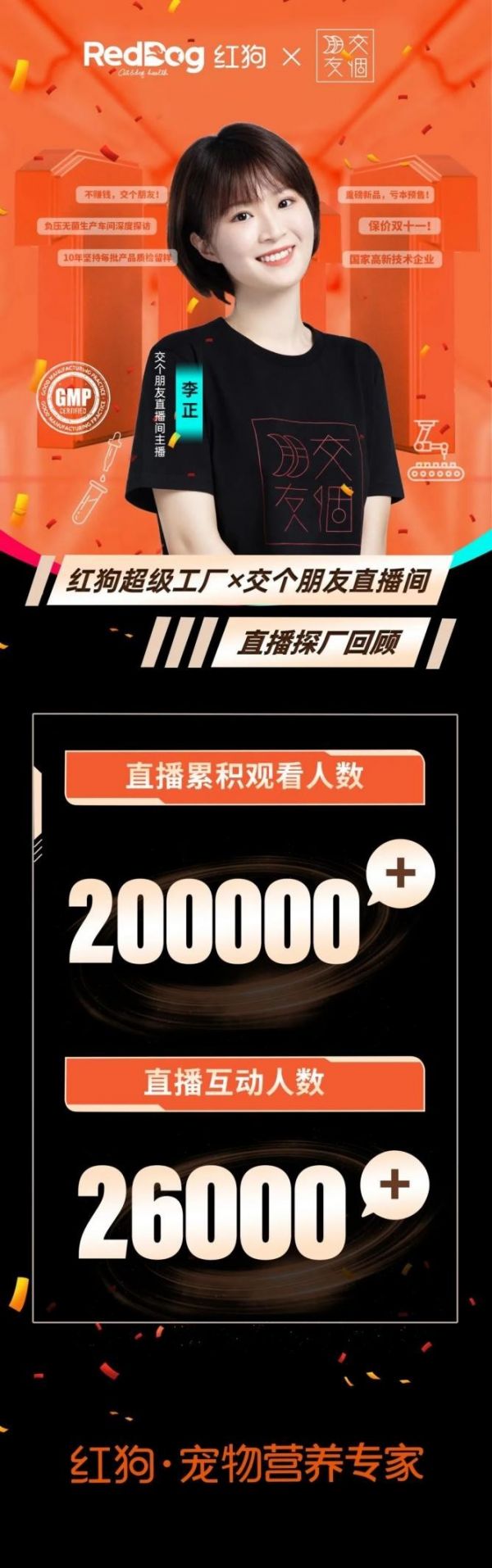 据RedDog红狗官方介绍,作为深耕宠物营养品10年的品牌,红狗集研发生产销售为一体的优势深得养宠用户信赖,此次“交个朋友直播间”与红狗超级工厂的合作也取得了亮眼的成绩,达到了1+1>2的效果。