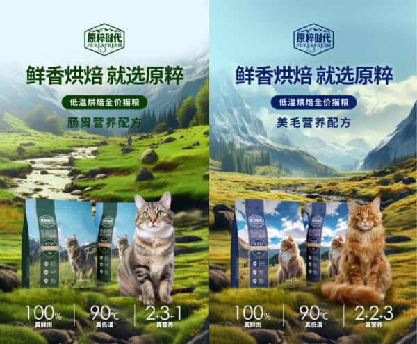 宠物营养品品牌RedDog红狗新推出的原粹时代以“鲜香烘焙,就选原粹”为核心传播语言,分为P(Pure)系列和F(Fresh)系列。P系列满足有肠胃需求、毛发需求的用户,F系列满足追求食材独特与新鲜的用户,包装上有明显的视觉区分。