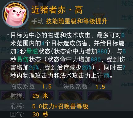 再看技能方面,猪的专属技能“近猪者赤”能造成极高的AOE伤害,提升自身物攻和法攻,同时附加眩晕和易伤效果。这个眩晕效果也让很多人在给猪学技能时候多了个思路,带上“束手攻击”和“高级眩晕”来打控制。但平心而论,我个人还是觉得猪做纯输出更猛一点。