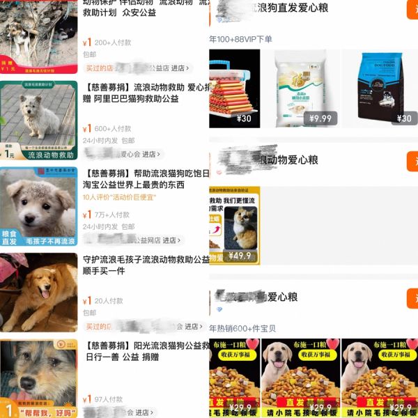 在电商平台上,“云喂养”商品的商品标题多为“基地专用猫粮”“救助狗粮直发基地”“流浪动物爱心粮”等,价格从几元到上百元不等。