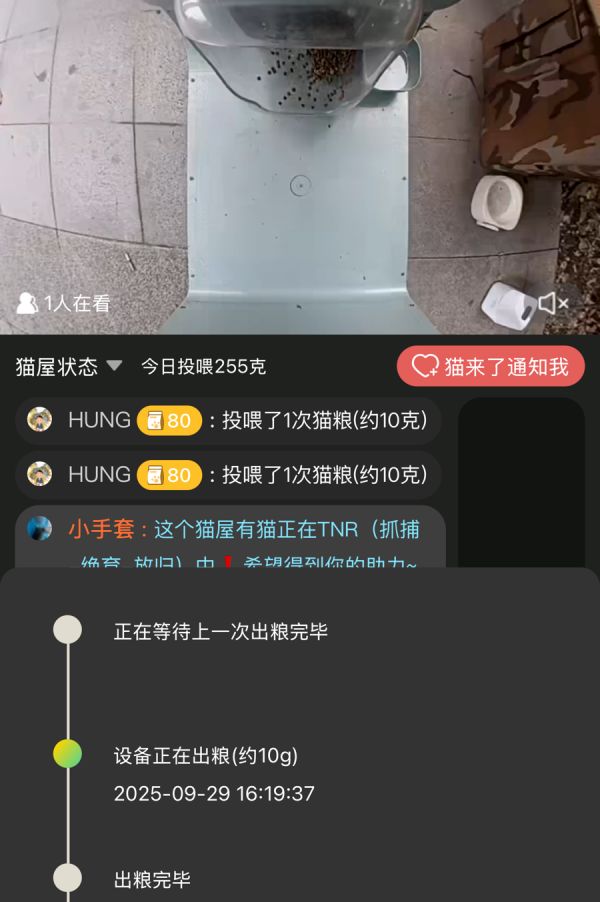 用户通过小程序付费喂食后,可实时看到猫屋中喂食器掉落猫粮的画面。