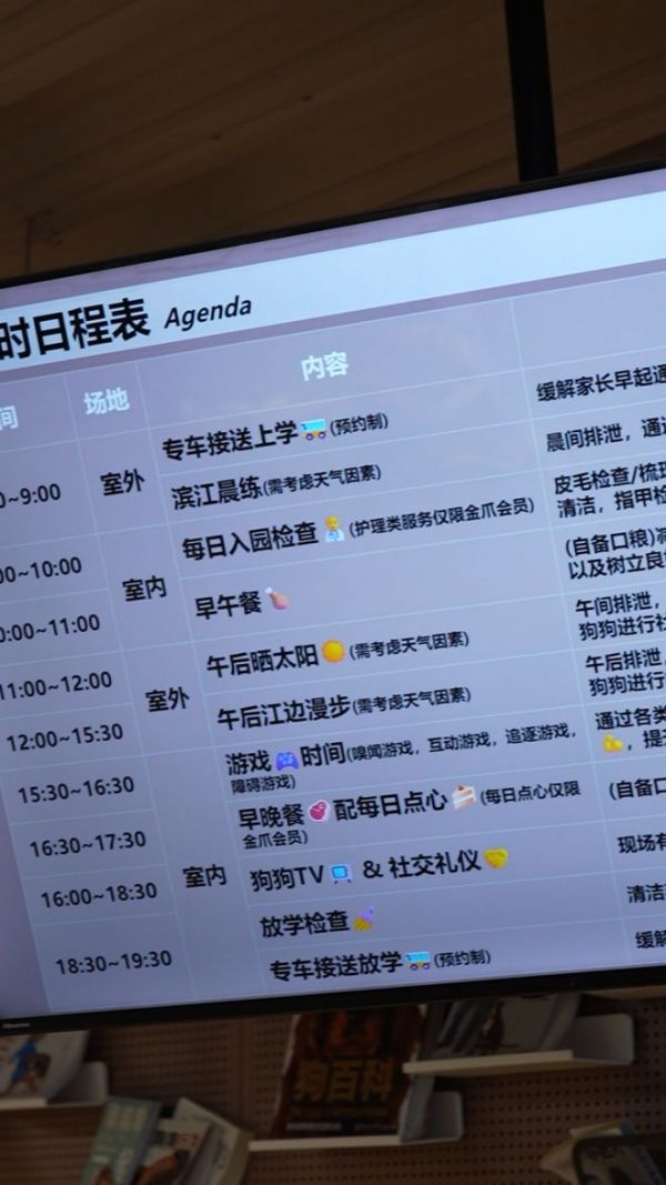 是的,你没看错,真的是幼儿园,人家每天还给宠物安排课程的。从下图来看,一天还挺忙碌的。(如下图)