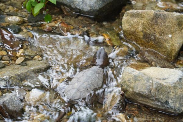 7月26日下午,在一处植被茂盛、水流清澈的溪流边,宁海县自然资源和规划局人员放生了这只濒危野生动物平胸龟。