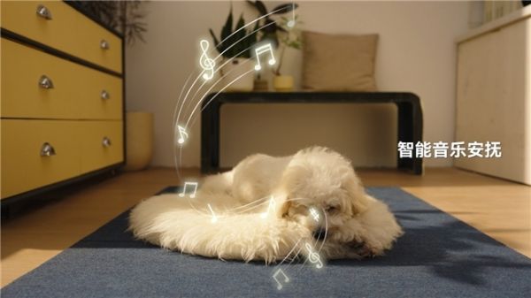 > "检测到狗狗情绪焦虑,已自动播放舒缓音乐。"
