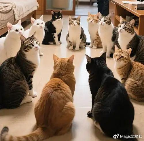 有时我们看到的猫群聚会,会呈现出一种近乎仪式感的场景:几只猫围坐成一圈,中间空无一物,气氛庄重。