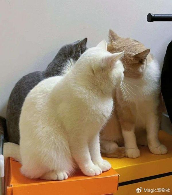 更有趣的是它们交流的方式——猫咪们互相蹭头、擦脸,并不仅仅是打招呼。