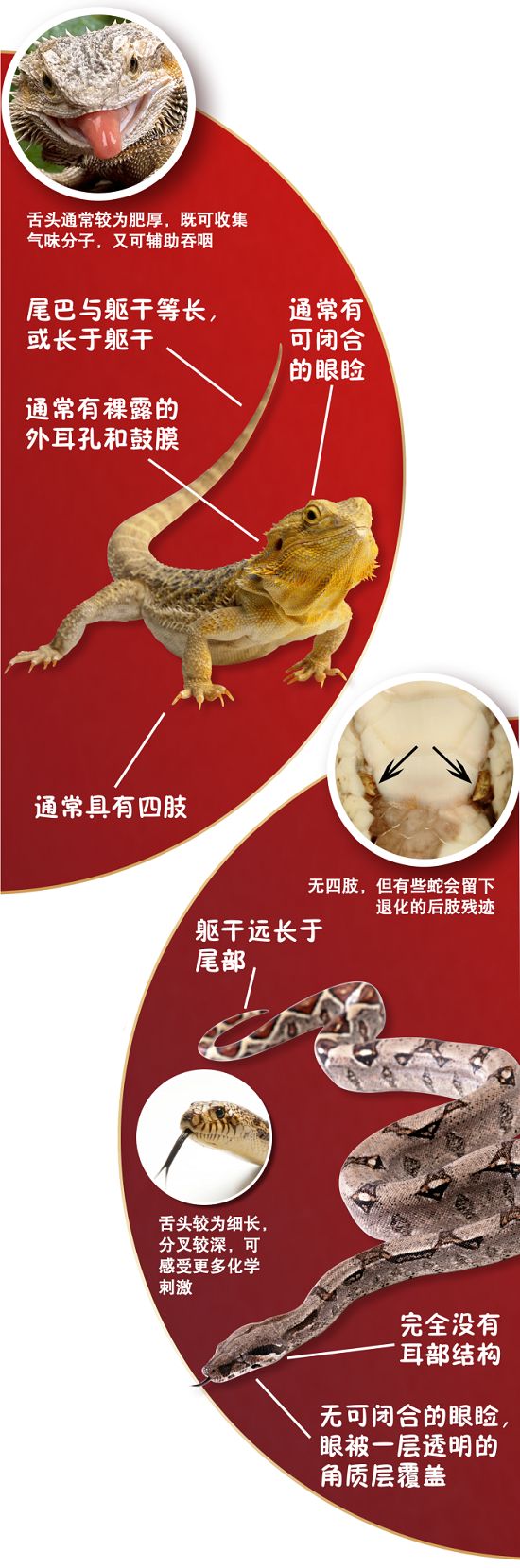 一般认为,蛇是由蜥蜴演化而来,二者的共同点包括盖满全身的鳞片、可移动的方骨、用来探知信息素的犁鼻器和蜕皮习性等。不过,蛇与蜥蜴的区别也是显而易见的。