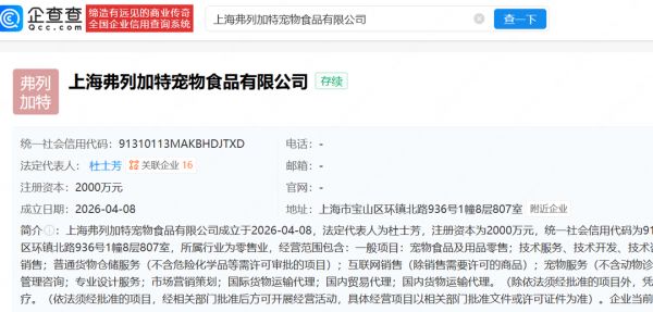 企查查显示,4月8日,山东知名宠物食品公司乖宝宠物(301498.SZ)认缴出资额2000万元,在上海成立全资子公司——上海弗列加特宠物食品有限公司(下称“上海弗列加特”)。