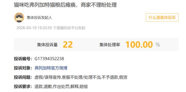 今年3月10日,黑猫投诉平台上发起一则关于乖宝宠物旗下弗列加特品牌的集体投诉,集体投诉量达22起,集中反映猫咪食用该品牌猫粮后出现瘫痪等症状。