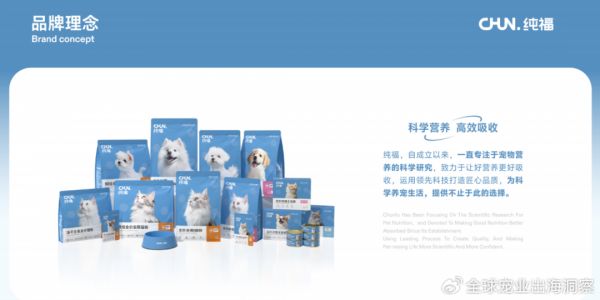 纯福成立于2020年,正值国内宠物食品行业追求高肉含量、高蛋白的潮流时期。然而,很多品牌并没有真正从宠物营养需求考虑,而纯福强调“科学营养和高效吸收”,旨在提升宠物的营养吸收效率。