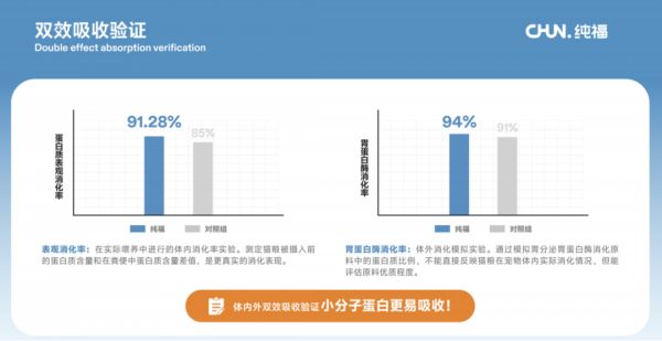 长达60天的喂养试验显示,食用纯福酶解主粮的宠物,其蛋白质表观消化率提升至91.28%,胃蛋白酶消化率达94%,直观体现了对宠物健康体态的促进作用。