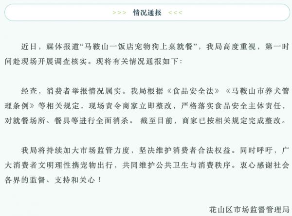 顾客携犬进入马鞍山一餐饮店就餐,市监局发布情况通报